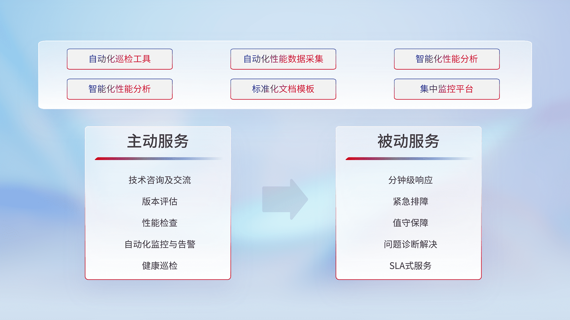 智能化工具和标准化文档,,,保障服务质量,,,,提供主动服务(包含技术咨询、、、、版本评估、、、性能检查、、、自动化监控与告警、、健康巡检)和被动服务包含(分钟级响应、、、紧急排障、、值守保障、、、、问题诊断解决、、SLA服务)。。。。