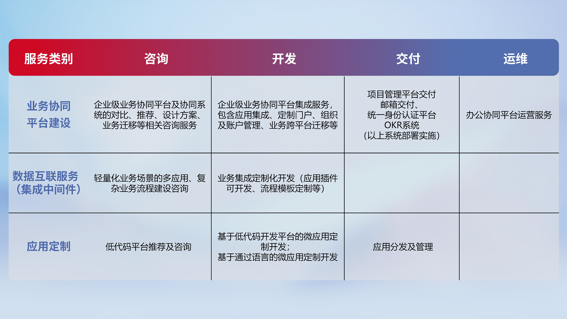 针对钉钉、、、、企微、、、IDaas等平台级产品提供产品的规划、、、、方案、、、、交付、、定制化开发等服务,,,实现如统一协同办公、、、、智能客户服务、、混合会议管理、、智能数据查询、、、、等业务场景,,,,实现数字化转型。。。。